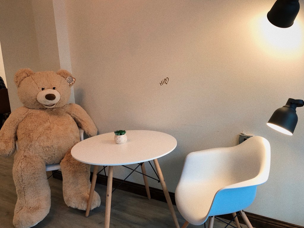 A huge teddy bear is welcoming you when you walk in to Tsaocaa. The warm light and soft decorations make you feel like home.