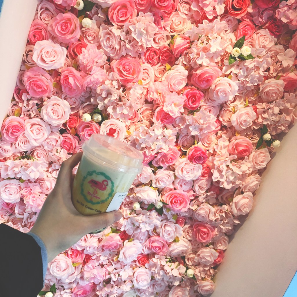 When you walk in, you will first be amazed by the lovely interior of the small shop. All walls are painted blue, and there is also a pink flower wall that is the best place to take a photo with your treat.